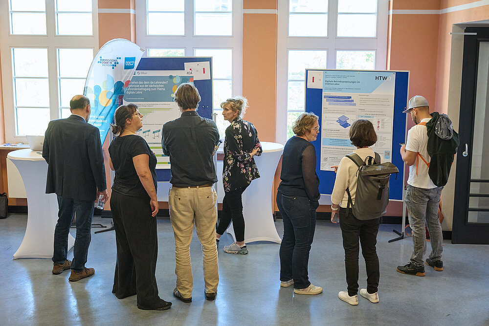 Im Foyer und Seminarräumen auf der 2. Etage des Lipsius-Baus präsentierten sich 16 Demo- und Posterpräsentationen. Bei einem jeweils ein-minütigen Pitch nach der Mittagspause konnten sich diese vorstellen und das Interesse des Publikums wecken. Anschließend war genügend Zeit, ins Gespräch über interessante E-Learning Tools zu kommen oder etwa die VR-Brille gleich einmal selbst auszuprobieren. Es konnte sowohl über die Ergebnisse aus der sächsischen Lehrendenbefragung zum Thema digitale Lehre mehr erfahren werden, als auch wie virtuelle Experimente in der Lehre barrierefrei gelingen. Einige Teilnehmende haben ihre Poster im Nachgang zur Verfügung gestellt und diese können virtuell auf der Website des Workshop on e-Learning 2025 durchstöbert werden.