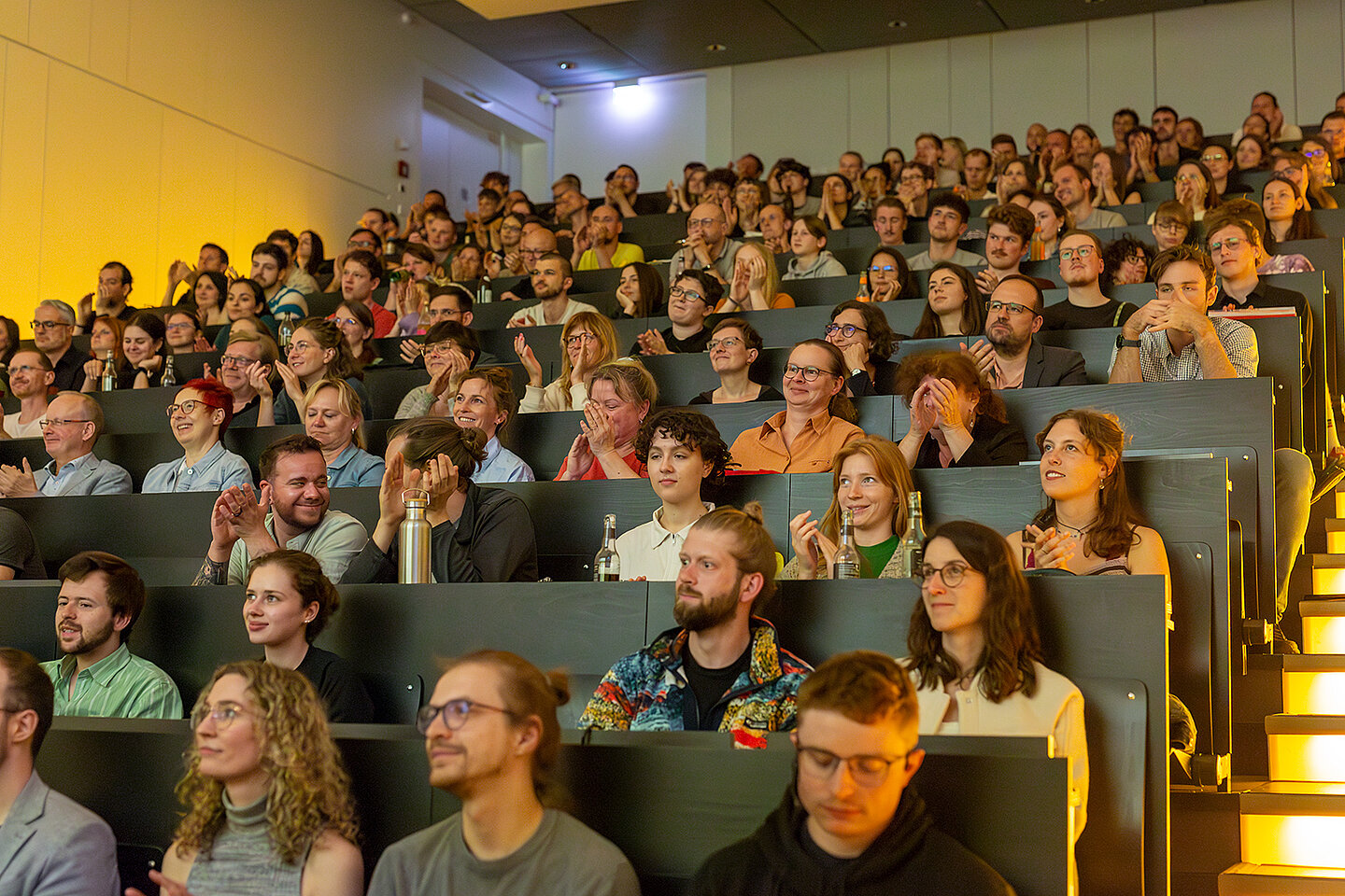 Krönender Abschluss des Tags war der Science Slam, bei dem vier Promovierende der HTWK Leipzig kurzweilig und unterhaltsam ihre Forschungsarbeiten präsentierten. Was hat künstliche Intelligenz mit Abwassersystemen zu tun? Wie kann man mit Licht Umweltschäden im Wasser erkennen? Warum braucht es neue Materialien für leistungsfähigere Batterien? Und wie findet man für jedes Haus die richtige Heizung? Diese spannenden Fragen wurden von Nachwuchsforschenden an der HTWK Leipzig beantwortet. Neben dem wissenschaftlichen Inhalt zählten vor allem die Verständlichkeit und der Unterhaltungswert des Vortrags.