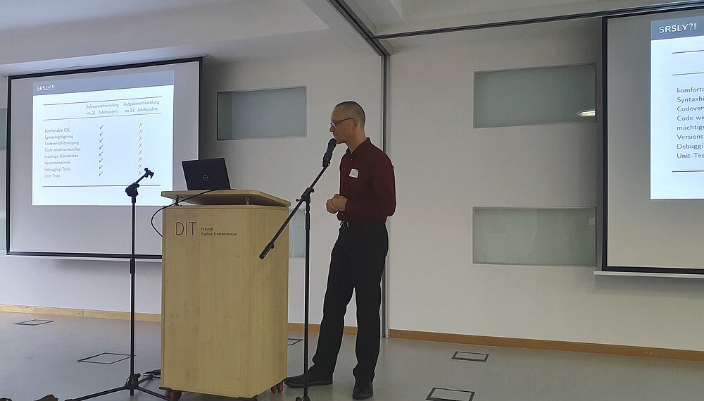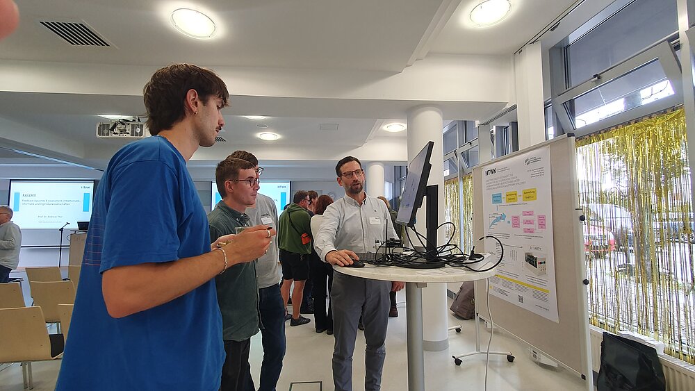 Das Abschluss-Event begann mit der Begrüßung durch den Prorektor für Bildung, Axel Klarmann. Die beiden Projektleiter Andreas Thor und Konrad Schöbel haben dann einen Blick zurückgeworfen auf die verschiedenen Facetten von vier Jahre Lehr-Lern-Projekt. Anschließend stellten sich die Teilprojekte in kurzen Pitches vor, bevor ausreichend Zeit an Ständen bestand, sich bei den Demopräsentationen selbst ein Bild zu den aktuellen Entwicklungen bei feedback-basierten E-Assessment in MINT-Fächern zu machen und das ein- oder andere Tool auch selbst auszuprobieren.